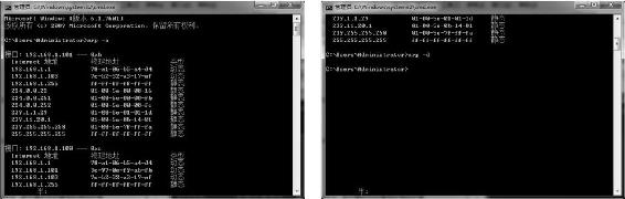 在每台计算机中都保存着一个ARP缓存表,其中记录了局域网中其他IP地址对应的MAC地址,以便访问到正确的IP地址。可以查看ARP缓存表,也可以对其进行删除。在“命令提示符”窗口中输入“arp -a”命令可以查看ARP缓存表中的内容,如左下图所示。而用“arp -d”命令可以删除ARP表中所有的内容,如右下图所示。