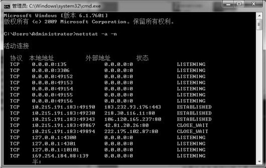 打开命令提示符窗口后输入“netstat -a -n”命令。