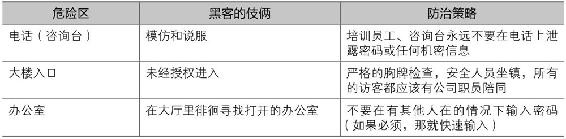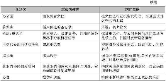 对于一个企业来说,信息攻击者可以冒充允许进入该区域的维护人员或勤务人员,进入一个防范疏忽的区域盗取密码、可以用在其他地方对企业的网络进行攻击的资料。俗话说“道高一尺,魔高一丈”,面对社会工程学带来的非传统信息安全的挑战,企业必须适应新的防御方法。下面介绍一些常见的入侵伎俩和防范策略,如下表所示。