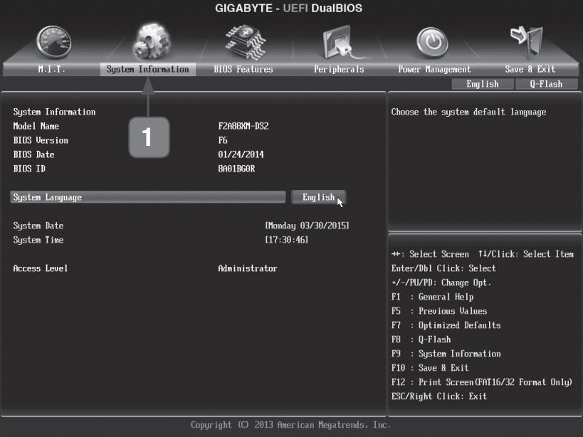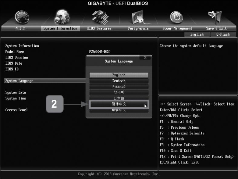 1 在启动电脑时按【Delete】键,进入BIOS设置界面。选择【System Information】(系统信息)选项。