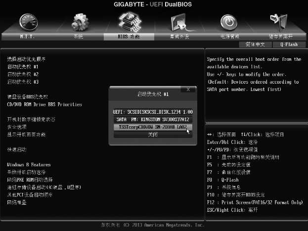 在弹出的【启动优先权 #1】对话框的列表中选择要优先启动的介质,如果是DVD光盘则设置DVD光驱为第一启动;如果是U盘,则设置U盘为第一启动。