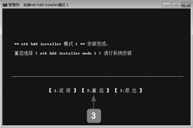 3 程序自动安装,安装完成后选择【2.重启】选项。