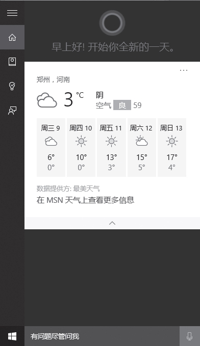 在Windows 10中,增加了个人智能助理——Cortana(小娜)。它能够了解用户的喜好和习惯,帮助用户进行日程安排、回答问题、查找文件、与用户聊天、推送资讯等,记录用户的行为和使用习惯,实现人机交互。