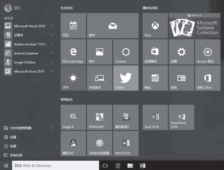 Windows 10重新使用了【开始】按钮,但采用全新的【开始】菜单,在菜单右侧增加了Modern风格的区域,改进的传统风格与新的现代风格有机地结合在一起,既照顾了Windows 7等老用户的使用习惯,同时又考虑到了Windows 8、Windows 8.1等新用户的习惯,下图所示即为Windows 10的开始屏幕。