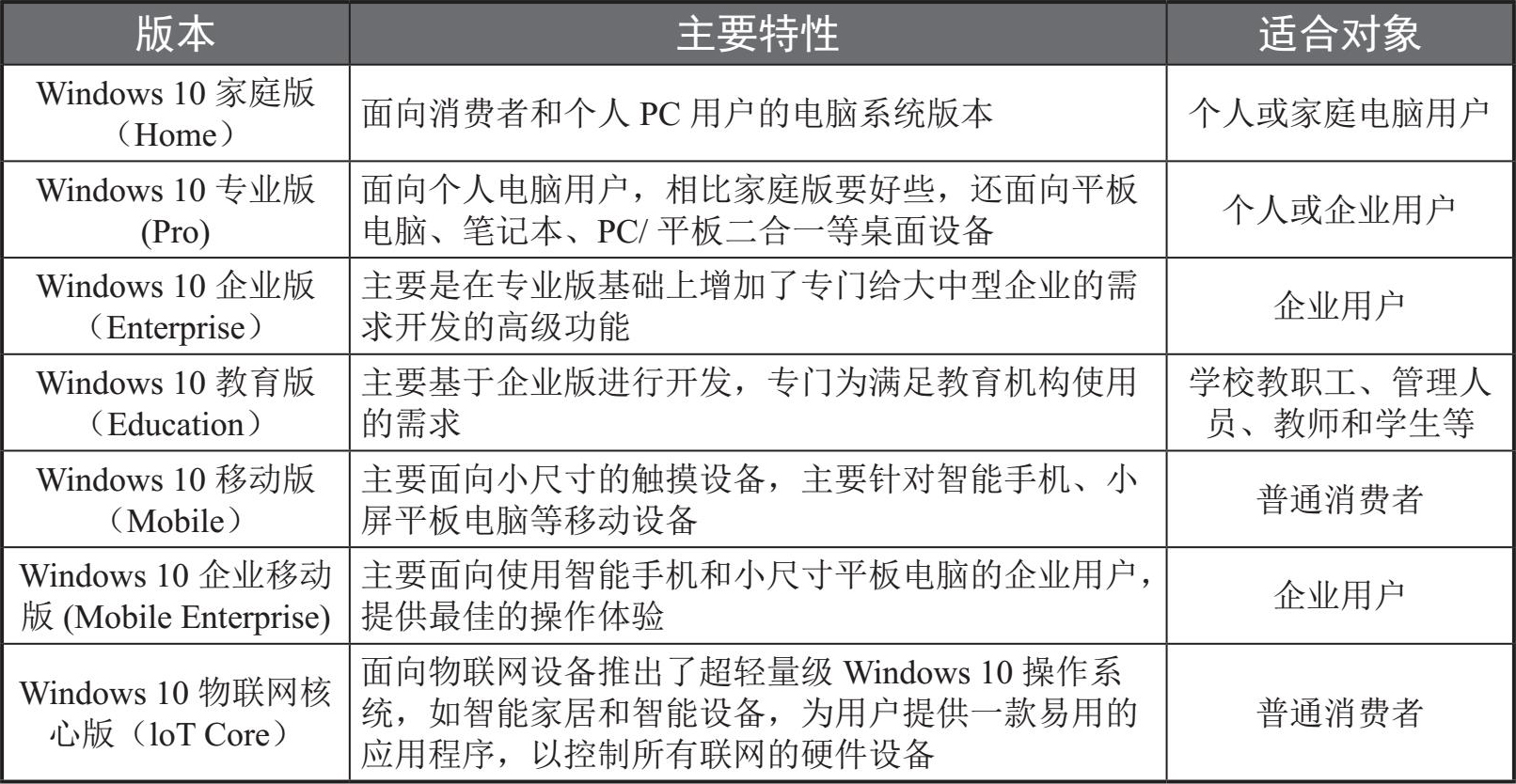 每一代Windows操作系统都会针对不同的市场、用户群体,根据功能特性,划分出多个系统版本,Windows 10也不例外。Windows 10共划分为7个版本,如下表所示。