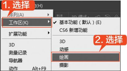 执行Photoshop CS6【窗口】→【工作区】→【绘画】命令,选择【画笔工具】