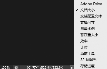 【文档大小】:显示有关图像中的数据量信息。选择该选项后,状态栏中会出现两组数字,如下图所示,左边的数字显示了拼合图层并储存文件后的大小,右边的数字显示了包含图层和通道的近似大小。