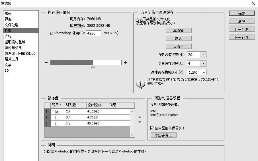 【高速缓存级别】:图像数据的高速缓存级别数。用于提高屏幕重绘和直方图显示的速度。为具有少量图层的大型文档选择较多的高速缓存级别,则速度越快;为具有较多图层的小型文档选择较少的高速缓存级别,则品质越高。所做的更改将在下一次启动Photoshop时生效。