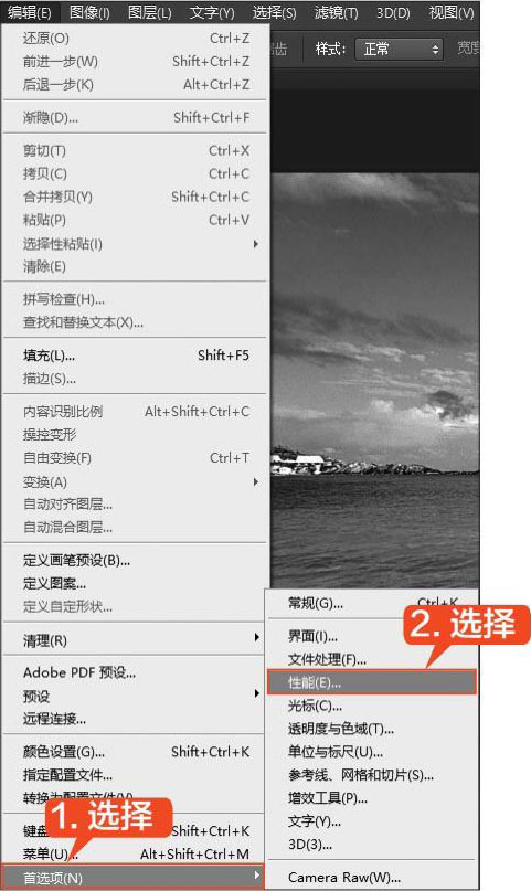 第1步 用户可以选择【编辑】→【首选项】→【性能】命令,如下图所示。