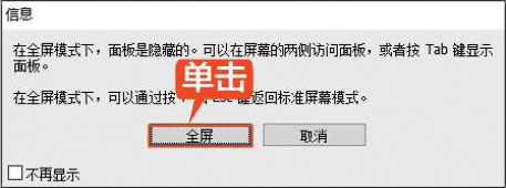 ,选择【全屏模式】时,系统会自动弹出【信息】对话框,如下图所示。单击【全屏】按钮,即可转换为全屏模式。