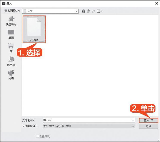第2步 选择【文件】→【置入】命令,在打开的对话框中选择随书光盘中的“素材\ch02\01.eps”文件,然后单击【置入】按钮,如下图所示。