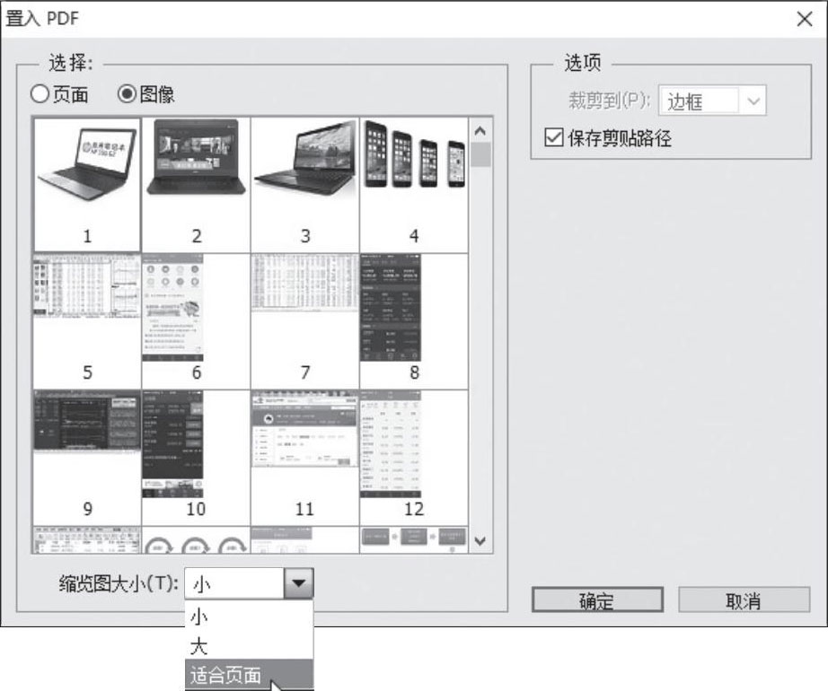 用户置入PDF格式文件和置入EPS格式文件操作方法类似,只是在单击【置入】按钮后会弹出【置入PDF】对话框,在该对话框中的【选择】选项区域中,根据要导入的 PDF 文档的元素,选中【页面】或【图像】单选按钮。如果 PDF格式文件包含多个页面或图像,就可以单击要置入的页面或图像的缩览图,如下图所示。