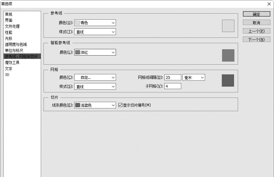 第3步 选择【编辑】→【首选项】→【参考线、网格和切片】命令,打开【首选项】对话框,在【参考线】【智能参考线】【网格】【切片】等选项组中设定网格的大小和颜色,如下图所示。也可以存储一幅图像中的网格,然后将其应用到其他的图像中。