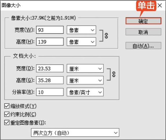 第3步 在【图像大小】对话框中可以方便地看到图像的像素大小,以及图像的宽度和高度。【文档大小】选项区域中包括图像的宽度、高度和分辨率等信息,可以更改图像的尺寸。在【图像大小】对话框中设置【分辨率】为“10”,单击【确定】按钮,如下图所示。