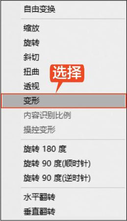 第4步 在定界框内右击,在弹出的快捷菜单中选择【变形】选项来调整透视,如下图所示。
