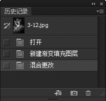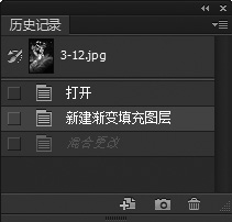 第6步 选择【窗口】→【历史记录】命令,在弹出的【历史记录】面板中单击【新建渐变填充图层】,如下图所示。可将图像恢复为最初打开的状态。