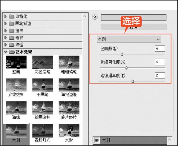 第2步 选择【滤镜】→【滤镜库】命令,在弹出的对话框中选择【艺术效果】→【木刻】选项,设置【色阶数】为“4”,【边缘简化度】为“4”,【边缘逼真度】为“2”,如下图所示。