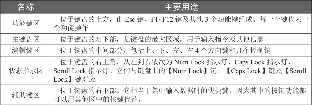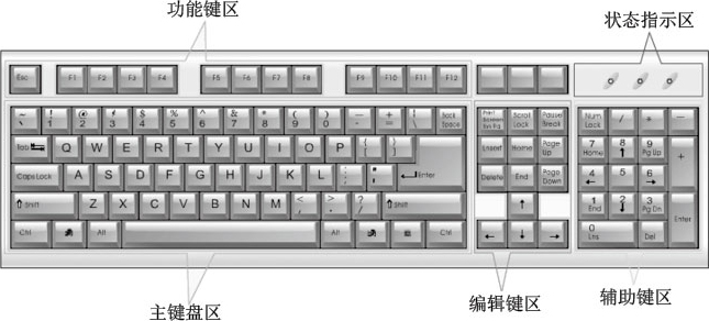 键盘的键位分布大致都是相同的,目前大多数用户使用的键盘多为107键的标准键盘。根据键盘上各个键位作用的不同,键盘总体上可分为5个大区,分别为功能键区、主键盘区、编辑键区、辅助键区、状态指示区。