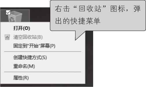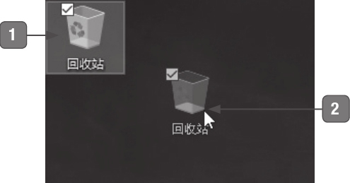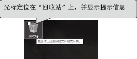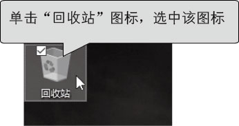 将鼠标指针移动到桌面上的“回收站”图标上,按住鼠标左键不放。