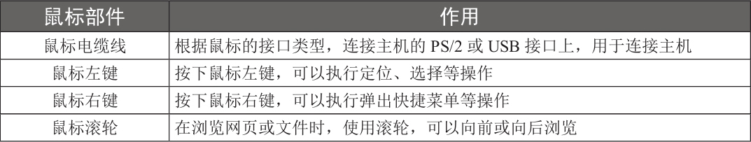 鼠标各部分的作用如下表所示。