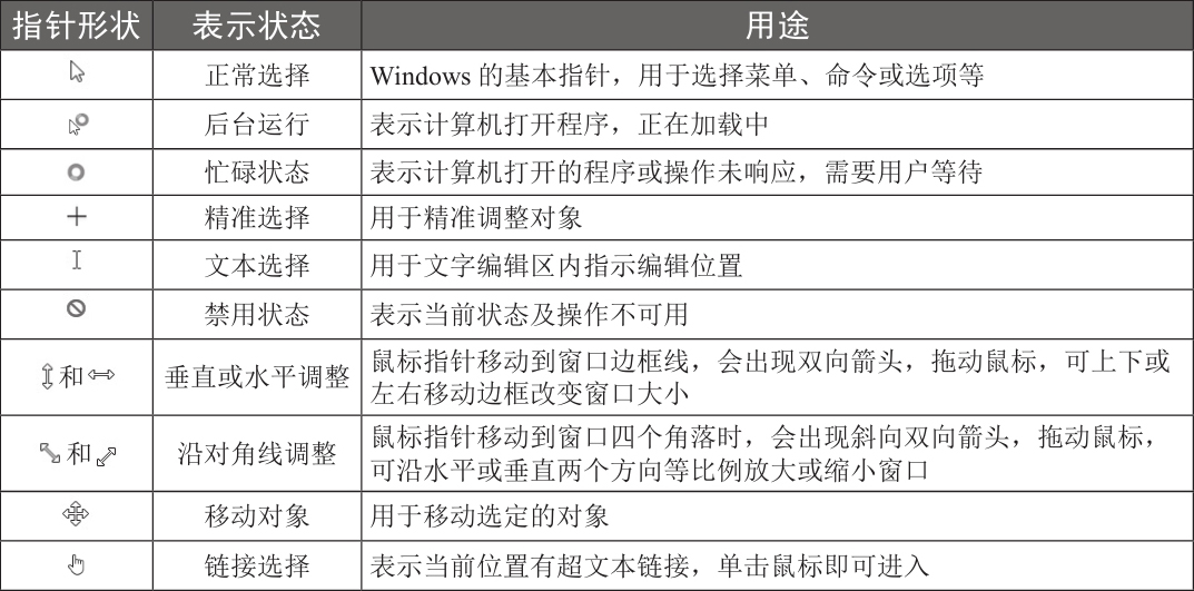 下表列出了常见鼠标指针的表示状态及其用途。