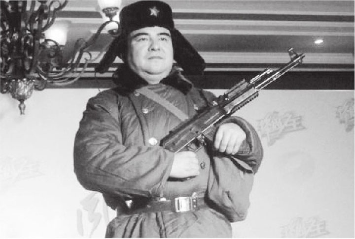 ▲身穿军大衣、头戴绿军帽、手持冲锋枪的陈光标