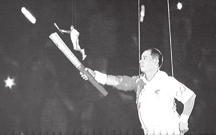 ▲李宁从天而降,点燃奥运主火炬