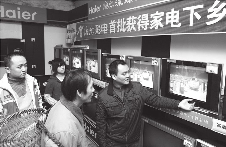 ▲几位农民在“家电下乡”网点选购补贴大彩电