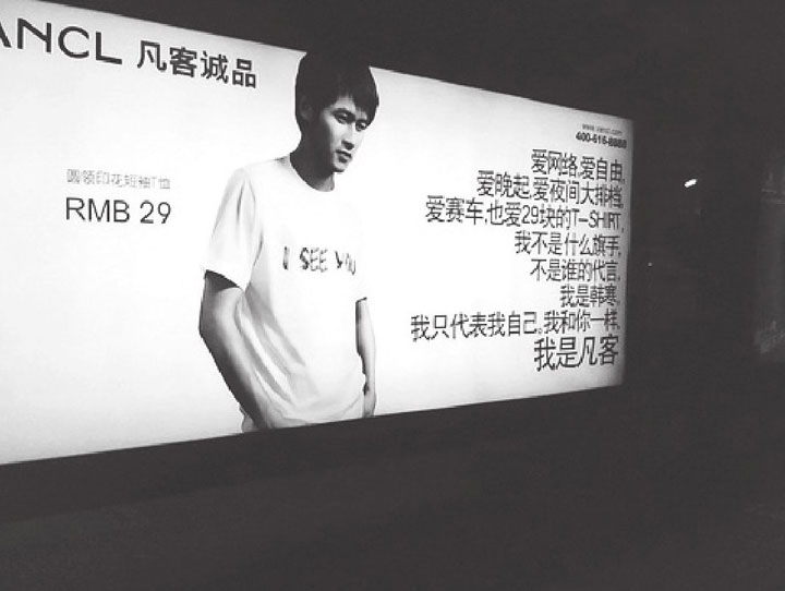 2010年的4月,柳絮如雪花飞扬的京城,晨起的人们突然发现,几乎所有的公交车候车亭都被一则清新的广告占领了:“爱网络,爱自由,爱晚起,爱夜间大排档,爱赛车,也爱29块的T-SHIRT,我不是什么旗手,不是谁的代言,我是韩寒,我只代表我自己。我和你一样,我是凡客。”韩寒是“80后”青年文学偶像,而凡客是一个陌生的服装电商品牌,它的创办人陈年无疑是今年最炙手可热的新晋互联网明星。