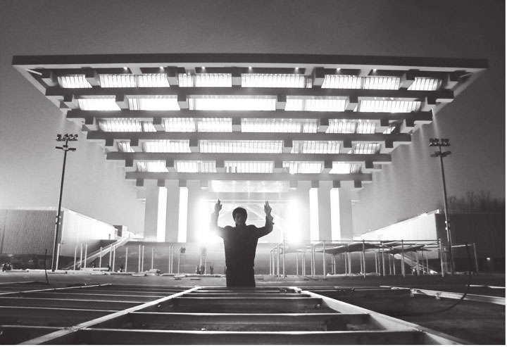 ▲上海世博园区,一位建筑工人在灯火通明的中国馆前做出“耶”的手势