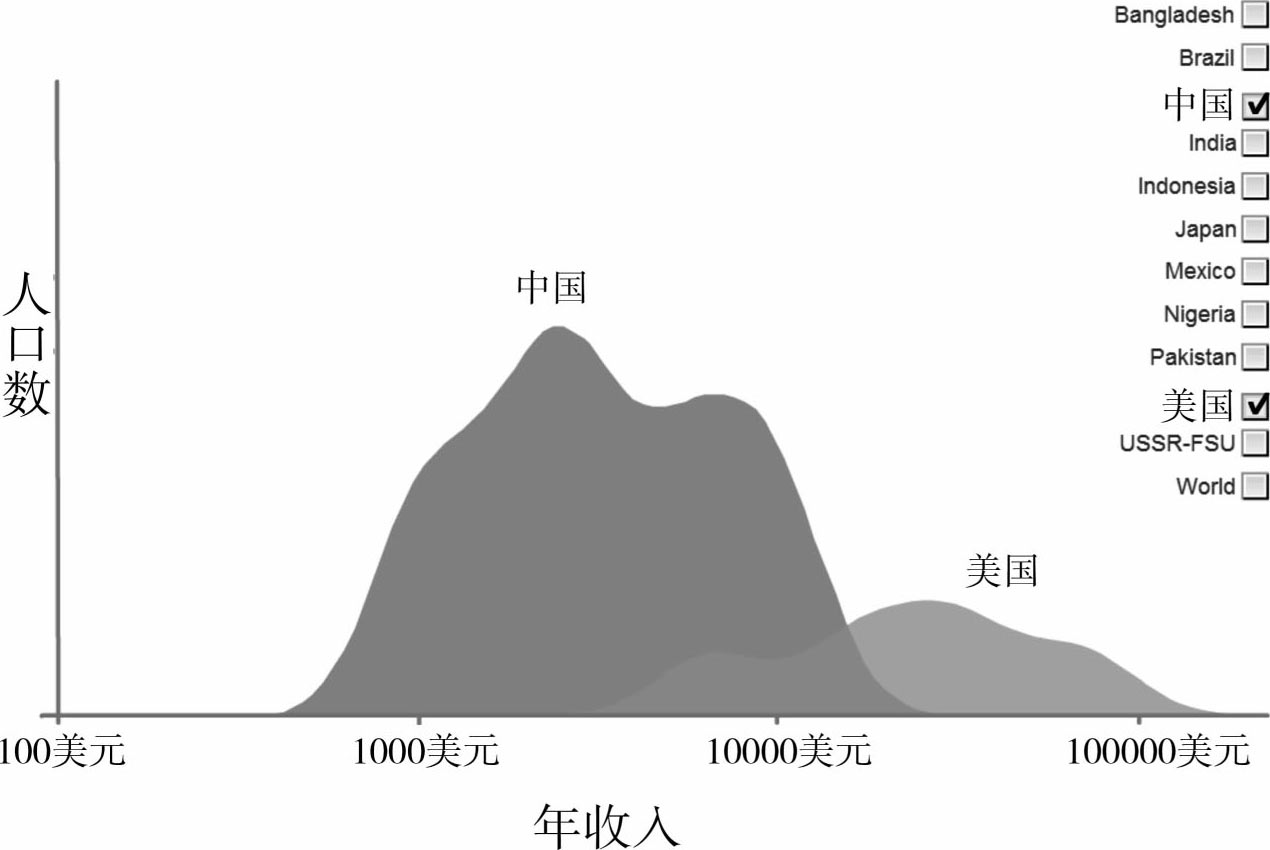 图1-1显示的是中美两国在1980年时的收入分配情况,横轴是收入水平,纵轴是人数。这里的收入是用购买力平价衡量的,也就是剔除了价格差异后的收入水平,这样可以使不同国家之间的收入具有可比性。图中左边的是中国,右边的是美国。很明显,1980年的中国比那时的美国穷很多,中国绝大多数人口比美国最穷的人还要穷,这体现为左边的部分几乎和右边没有交集。那时,中国的收入分配差距也要比美国小很多,这体现为左边的分布比右边的分布“瘦”不少。图1-2是两国在2000年时的收入分配情况,从图中不难看出,中美的收入差距下降了很多。中国富裕人群的收入已经大致相当于美国中产阶层的水平。而中国的收入分配差距也拉大了很多,这表现为中国的分布变“肥”了不少。不过,还有一件事情是,中国分布的“肥”的程度和美国分布的“肥”的程度是大致相当的,也就是说中国收入分配的差距和美国是大致相当的。当然,这样用眼睛看的结果可能很不准确,不过,更精确的、用基尼系数衡量的中美收入分配差距也支持这一结论。