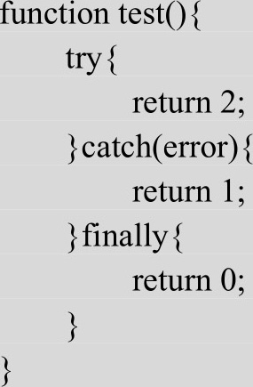 这个函数在try-catch语句的每一部分都放了一条return语句。表面上看,调用这个函数会返回2,因为返回2的return语句位于try语句块中,而执行该语句又不会出错。可是,由于最后还有一个finally子句,结果就会导致该return语句被忽略,也就是说,调用这个函数只能返回0。如果把finally子句去掉,这个函数将返回2。