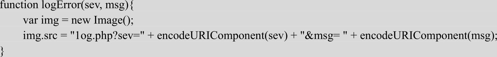在上面代码中,logError()函数接收两个参数:表示严重程度的数值或字符串,以及错误消息。其中,使用了Image对象来发送请求,这样做非常灵活,主要表现在如下几方面。
