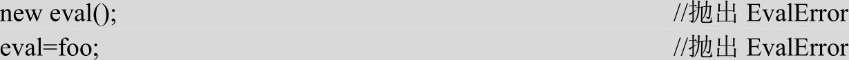 在实践中,浏览器不一定会在应该抛出错误时就抛出EvalError。例如,Firefox 4+和IE 8对第一种情况会抛出TypeError,而第二种情况会成功执行,不发生错误。因此,在实际开发中极少会这样使用eval(),所以遇到这种错误类型的可能性极小。