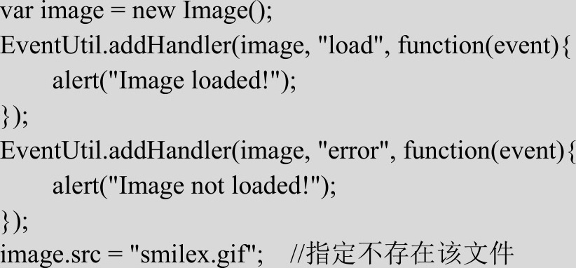 【拓展】 图像也支持error事件。只要图像的src特性中的URL不能返回可以被识别的图像格式,就会触发error事件。此时的error事件遵循DOM格式,会返回一个以图像为目标的event对象。