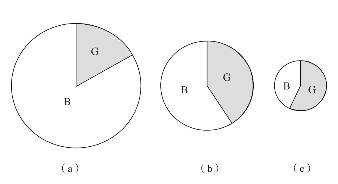 如图1-1所示,商家G和消费者B在三种不同信息能力水平下的利益分配饼图。这三幅饼图的结果都是假设商家是主动方,他们针对每一个给定的信息能力水平,通过调整产品的价格和质量,最大化其利润总量(商家的利益容易测量,就是它的利润)。最右侧(c)图对应的消费者信息能力最低,商家为了最大化利润必须拿走更大比例的饼,事实上他们也能够做到拿走更大比例,因为这个状态下的消费者信息能力低,对质量高低缺乏判断力,商家可以以次充好、鱼目混珠,获得更大比例的利益。但是由于总饼很小,所以商家实际分得的绝对数量小了。最左侧的(a)图,消费者信息能力最高,虽然饼大了,但面对懂行的消费者,商家不得不降低所占份额。(b)图,当消费者信息能力处于某个特定的中间水平时,尽管这个饼不是最大的,但是商家的绝对利润却是最大化的。