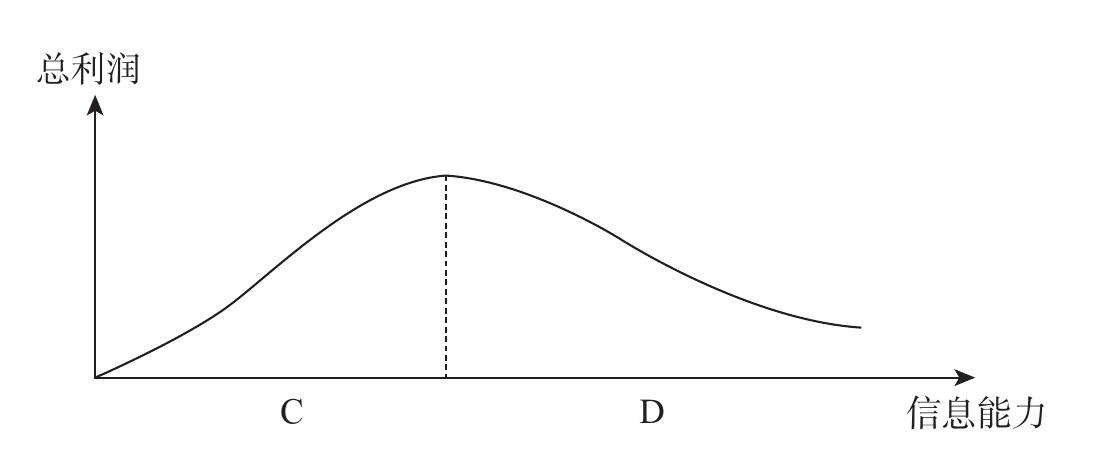 ,一个信息充分的市场会导致充分的竞争,从而利润率将会有效地减少到零。因此,当消费者的信息能力水平持续上升时,商家的利润率被进一步压缩,销售量的增长将不足以弥补单位利润率下降造成的损失,从而形成D区域的总利润下降。当然,消费者并不容易真正对产品的情况了如指掌,而且消费者常常把他的信息能力分散到众多的可选商品中,因此分配到单个商品的信息能力就下降了