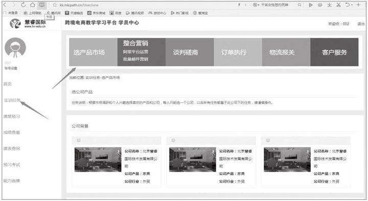 (3)在左边页面的下拉菜单中单击“实训任务”链接,然后单击“选产品市场”,如图1-14所示。