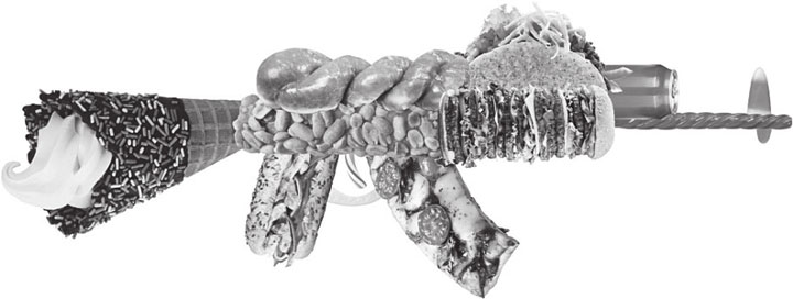 此外,很多公司吹嘘自己产品的诱惑力:“打赌你不会只吃一个”。它们聘请食品专家把糖、盐、脂肪混合出完美的质地,让产品吃起来松脆可口、香味扑鼻,以触发大脑的“餍足点”。这就像吸食可卡因,让你真正爱上低品质食物。这就是大家喜欢糖果、甜甜圈、糕点、薯条和面包,并且无法自拔的原因之一。他们不是为了生存而吃东西,而是患了食物成瘾,这种瘾是商人为了利润而人为制造出来的。一位女士曾对我们说,她宁可得癌症也不会放弃吃糖。我们怀疑她在上高中时和坏小子谈过恋爱。如果你爱着会伤害你的东西,那就需要认真地审视了。