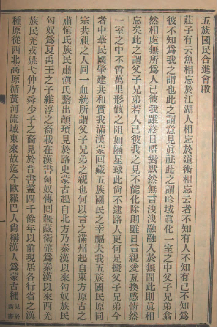 辛亥革命爆发后,基于“五族共和”理念建立起来的中华民国的领导者们,很快意识到国内各民族实现一体化,即“大同”与“合进”的必要与紧迫。临时大总统孙中山迅速批准黄兴等发起组建“中华民族大同会”,可谓前驱先路;继任的总统袁世凯,也很快授意成立声势浩大的“五族国民合进会”,强调各族本来“同源共祖”,当取长补短,“举满、蒙、回、藏、汉五族国民合一炉以冶之,成为一大民族”,具有标志意义。可以说民国建立后,现代中华民族观念才得以真正确立,但其真正广泛传播开来,则是在20世纪20年代初期之后。