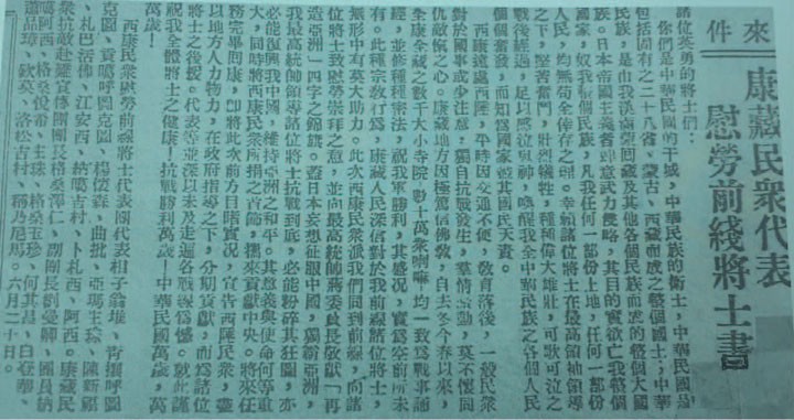 1938年4月,蒙古族代表巴文峻、达密琳多尔济等,藏族代表贡觉仲尼、罗桑坚赞等,新疆回族代表尧乐博士、麦斯武德、艾沙等组成“蒙藏回族慰劳抗战将士团”,并发布“告全国同胞书”和“敬告全国抗战将士书”,宣称国内各族“同为组成中华民族的份子”,“存亡与共,相依为命”,并高呼“中华民族万岁!”此图为“敬告全国抗战将士书”(《蒙藏月报》1938年第2期)