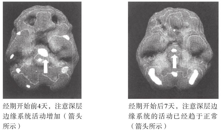 虽然很多人质疑经前期综合征(premenstrual syndrome,PMS)的存在,但是研究表明,这种病是确实存在的。有很多女性确实患了这种病。她们大脑中的化学物质反复交替地变化着,导致她们产生了一些连自己都控制不了的行为。在深层边缘系统中存在着大量的雌激素受体,这使深层边缘系统对雌激素分泌水平的变化非常敏感。对于女性来说,雌激素的分泌水平会在青春期初潮来临前、刚生育时和绝经期发生较大的变化。