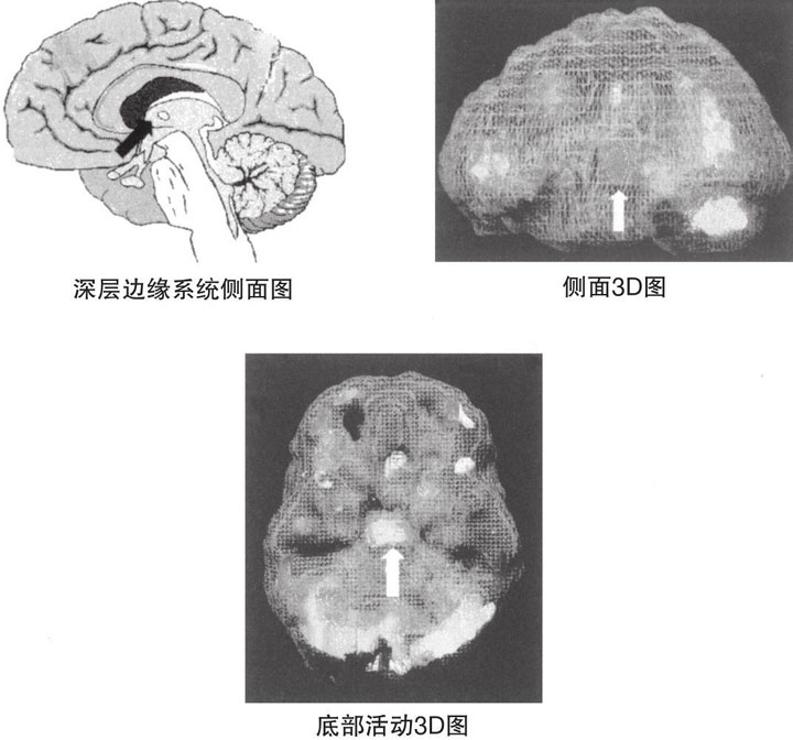 在一位成年男性抑郁症患者身上,我进一步研究了这个现象。这位患者的脑扫描图像显示出了很高的深层边缘系统激活水平。性生活后一个小时内的扫描结果发现,他的深层边缘系统的激活水平显著降低了。性高潮是深层边缘系统的小范围发作,有利于释放或者缓解深层边缘系统的活动张力。