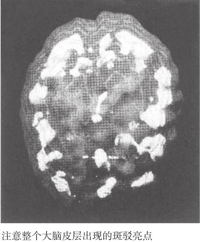 要对她进行脑部扫描并不是一件容易的事。临床大夫尝试了三次。前两次她都拔掉了静脉注射管,并大声说我们想毒死她。第三次,她的妹妹和她交谈后令她放松下来,这一次终于成功了。当扫描结果显示出她的深层边缘系统整体上存在过度激活时,我发现她左侧的大脑激活程度更高,即深层边缘系统有非常集中的焦点,并且整个大脑皮层都出现了明显的斑驳亮点(见图2-2)。换句话说,萨拉的一部分脑区显示出了过度激活,而另一部分脑区则呈现出抑制的状况。经验告诉我,周期性心境障碍通常都会和这种情况有关。