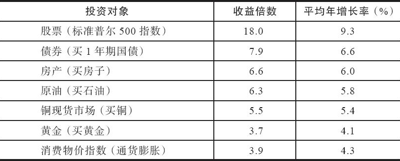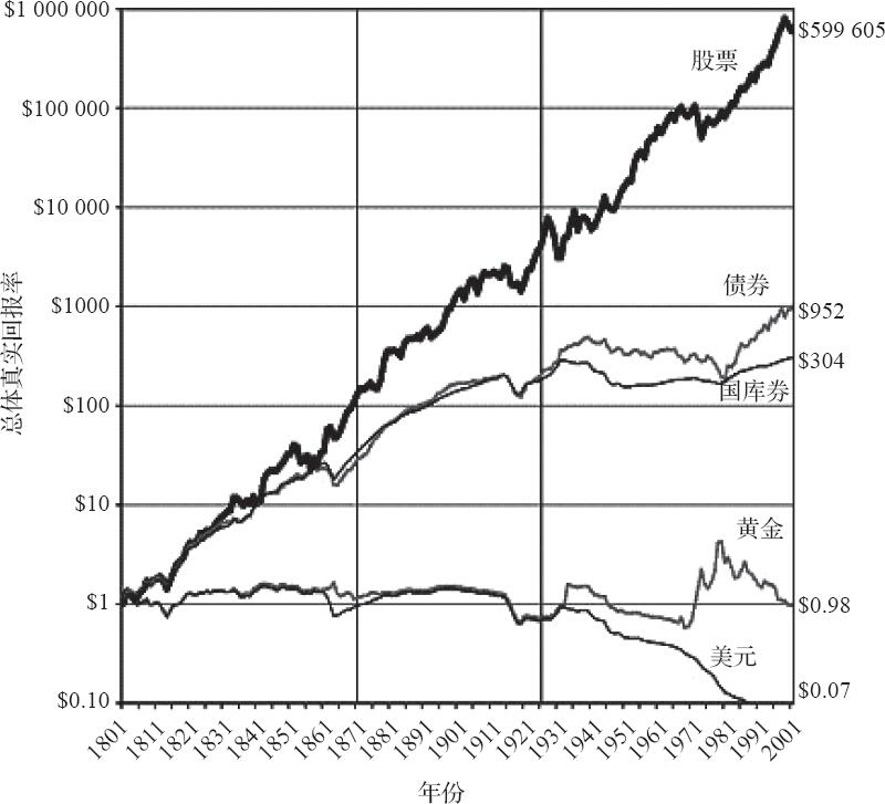 图2-2是美国资产配置数据,我们可以看到,1801~2001年,股票翻了60万倍,而债券只有1000倍。如果这200年你持有的是黄金资产,那么收益率近乎为0,根本跑不赢通货膨胀。