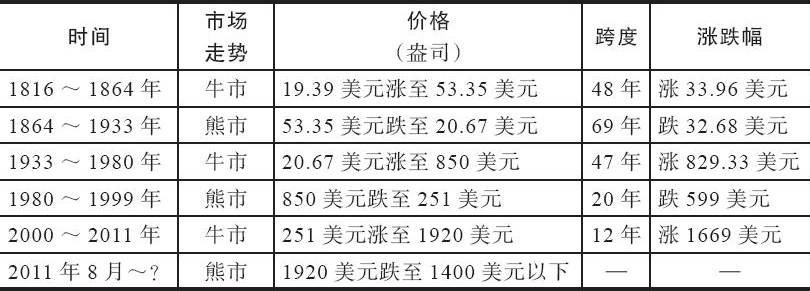 表2-2 1864年以来黄金历次牛熊市概览表