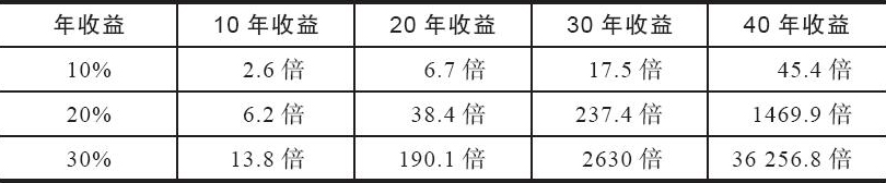 从上述数据中我们可以看出,如果你投资10万元,能赚取股市的一般收益10%,40年后你的资产为454万元;如果你能够坚持长期投资增长速度较高的优秀企业,赚取20%的年收益,40年后你的资产将变为1.47亿元;如果你能成为杰出的投资大师,做到30%的年收益,那么40年后你的资产将变成36.2亿元。