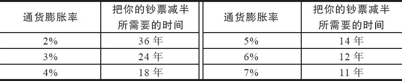 通货膨胀才是个人投资者的大问题,日常或波动性的股价改变虽然惊心动魄,最让投资人担心,却不是个人投资者最大的忧患。通货膨胀的侵蚀力量才真的令人害怕,以5%的通货膨胀率来说,你的钞票的购买力在不到15年内,就会少掉一半,在随后的5年内,又会再少掉一半。通货膨胀率如果是7%,只要经过21年,也就是从61岁“提早”退休,到82岁为止,你的钞票购买力就会降到只有目前的1/4。