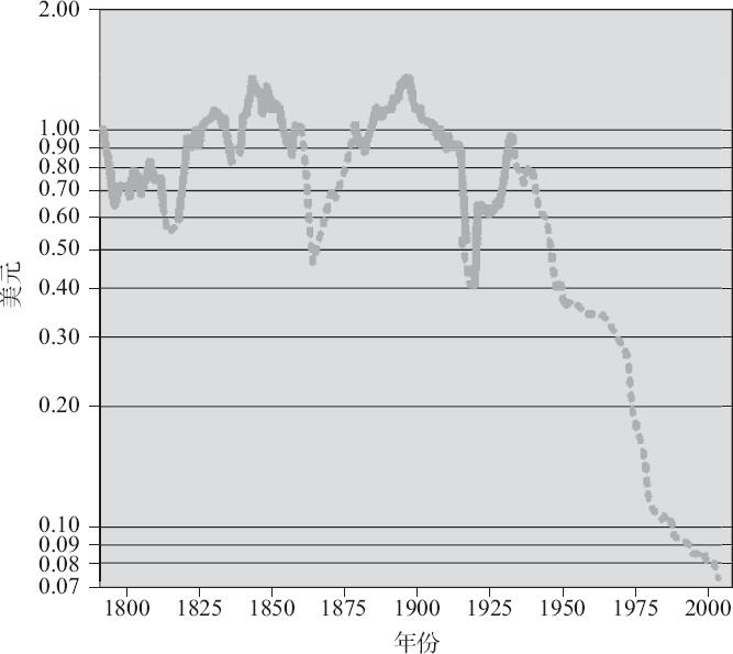 我们先来看图2-1,它显示的是1800~2000年这200年间美元的购买力变化。