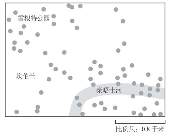 康奈尔大学的心理学家托马斯·季洛维奇在其1991年的作品中写到了“二战”时期德国人轰炸伦敦时伦敦市民经历的一件事。伦敦报纸曾经刊登出几幅图,其中一幅如图1–3所示,该图显示的是德国V–1导弹和V–2导弹攻击伦敦市中心的具体位置。你可以看到,轰炸的地点看上去并不是随机的,因为导弹大部分都落在泰晤士河的两岸及图示的西北部区域。当时的伦敦人由此认为德国人能够精准地控制导弹的落点。一些伦敦人甚至认为,图中空白的地方便是德国间谍的居住地。实际上,伦敦人错了,德国人所能做到的只是将导弹投到伦敦市区,至于具体炸到哪个区域便只能听天由命了。一项关于这些导弹袭击分布得更为详细的统计研究表明,这些轰炸地点的确是随机分布的。